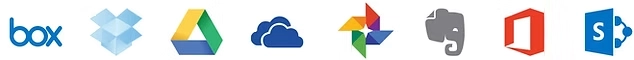 Google Drive, Dropbox, Box, Picasa, Microsoft OneDrive, Microsoft Office365, and Evenote.